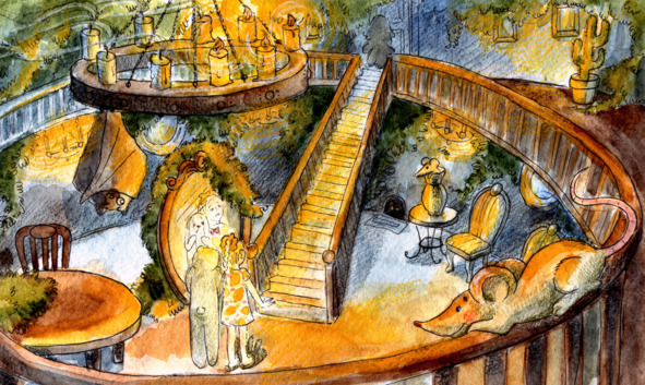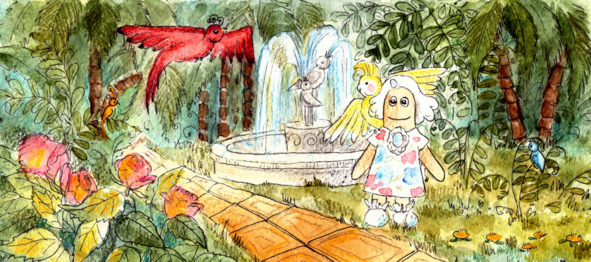 После знакомства хозяева предложили нашим друзьям посмотреть их дом. Васёна очень этому обрадовалась, ведь ей нужно было поискать дорогу к родителям. Компания поднялась на верхний этаж, и там оказалась прекрасная оранжерея под стеклянным куполом. Диковинные деревья, кустарники и цветы жили в доме призрачного семейства и были окутаны любовью и заботой. В саду жили тряпичные птицы, которые спели гостям волшебной красоты песни, а в центре оранжереи блестел и сиял голубой прозрачной водой красивый бассейн с фонтаном. Очень было удивительно обнаружить такую красоту в старом покосившемся особняке.