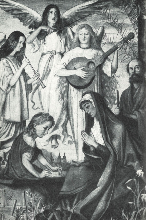 Рисунок Павла Жуковского, на котором он изобразил себя в виде Св. Иосифа, Зигфрида в виде мальчика-Христа с рубанком в руках, Даниэлу в виде Богоматери и остальных сестер в виде ангелов