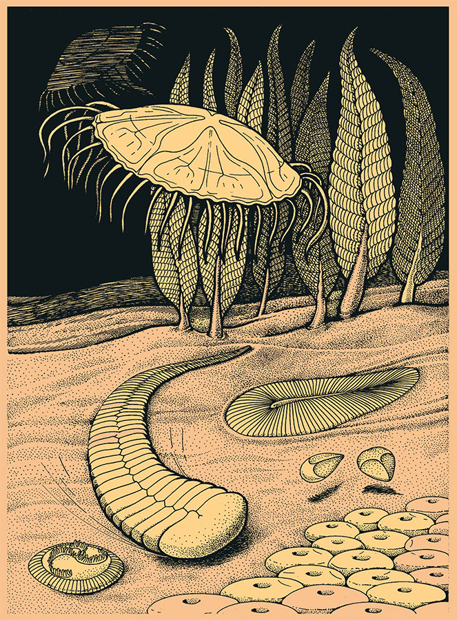 На переднем плане – слева на дне лежит трибрахидиум (Tribrachidium), в центре – загадочная сприггина (Spriggina), справа от нее плоская червеобразная дикинсония (Dickinsonia), две парванкорины (Parvancorina) и многочисленные кишечнополостные полипы – немианы (Nemiana)