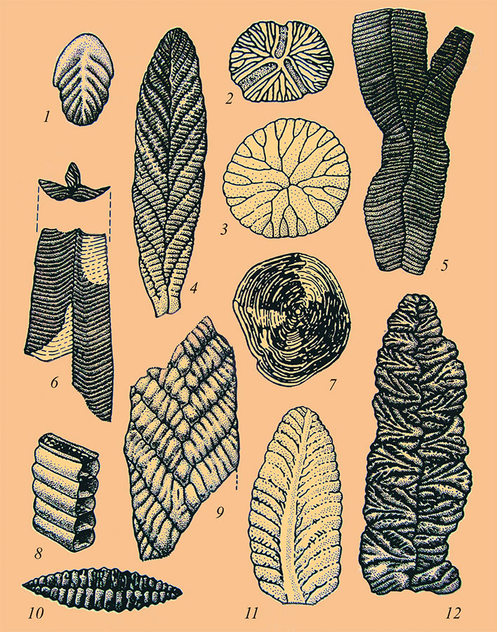 1 – вендия (Vendia); 2 – альбумарес (Albumares); 3 – ругоконитес (Rugoconites); 4 – чарния (Charnia); 5 – филлозоон (Phyllozoon); 6 – птеридиниум (Pteridinium); 7 – оватоскутум (Ovatoscutum); 8 – схема строения отдельных сегментов вендского организма (так называемое «стеганное одеяло»); 9 – глесснерия (Glaessneria); 10, 12 – веретеновидные формы, возможно, родственными петалонамам (Petalonamae); 11 – рангея (Rangea)