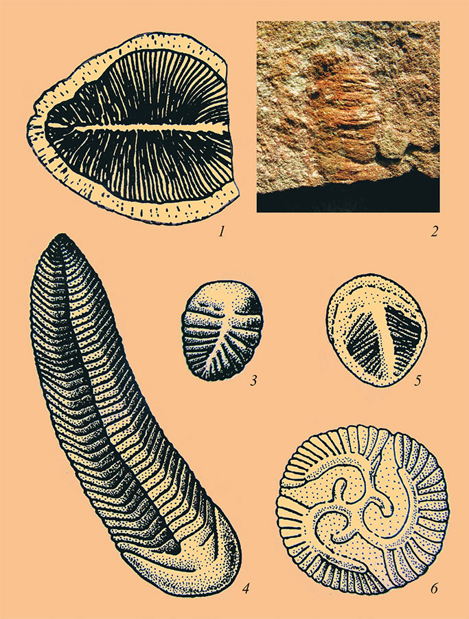 1 – дикинсония (Dickinsonia); 2 – саарина (Saarina), органическая трубка с поперечной сегментацией, ширина – 5 мм, лев. берег р. Онеги, ниже с. Ярнема, Архангельская область (сходные формы изображены в: Соколов, 1997, с. 126–127, табл. XIV); 3 – вендомия (Vendomya); 4 – сприггина (Spriggina); 5 – парванкорина (Parvancorina); 6 – трибрахидиум (Tribrachidium