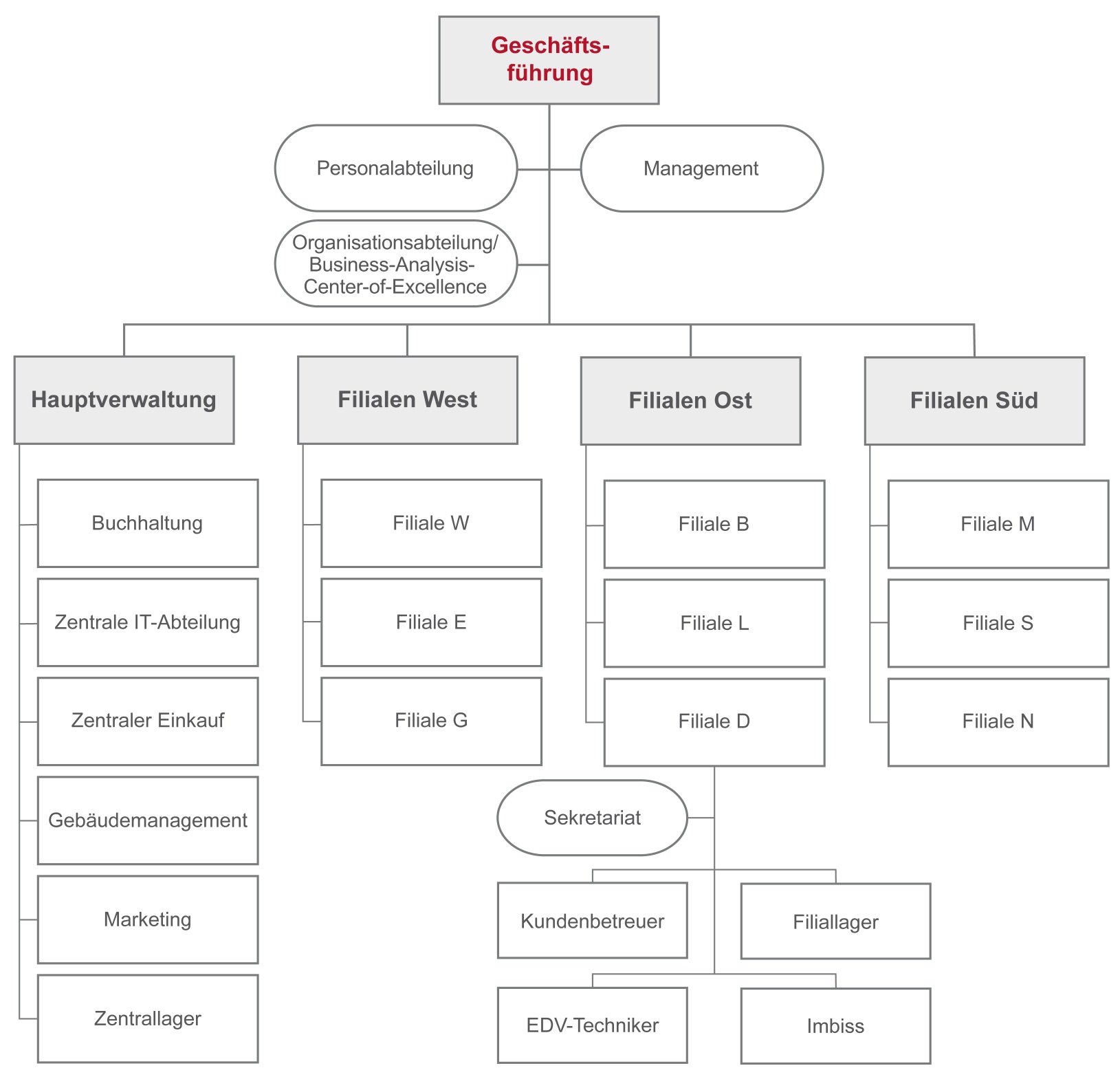In der Hauptverwaltung arbeiten ca. 100 Personen: neben der Geschäftsführung sind dort die Buchhaltung, das Marketing, die zentrale IT-Abteilung, der zentrale Einkauf, Personalabteilung, Organisationsabteilung und das Gebäudemanagement angesiedelt (vgl. Abb. G.03).