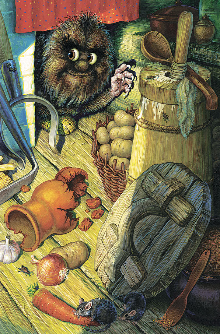 – Домовой, домовой,Что сидишь ты за трубой?Выйди на минуточку,Поиграй со мной в игрушечку,Дам тебе за это булочку!Скрипнула на полу половица. Мальчик обернулся – никого нет. Потом посмотрел на полку. Вдруг косматая, костоватая рука хвать с полки булочку и исчезла в одну секундочку.