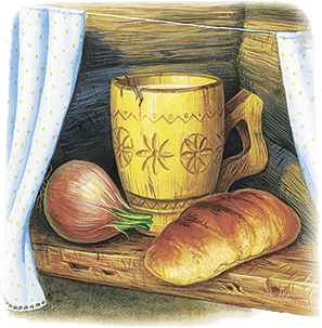 – Домовой, домовой,Что сидишь ты за трубой?Выйди на минуточку,Поиграй со мной в игрушечку,Дам тебе за это воды кружечку!Не выходит домовой. Всё стучит, гремит за печной трубой. Положил мальчик на полку луковичку и опять зовёт:
