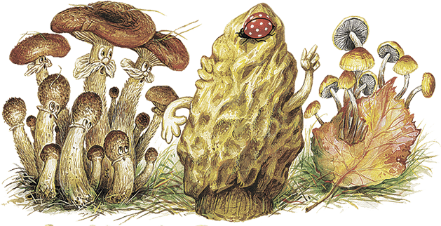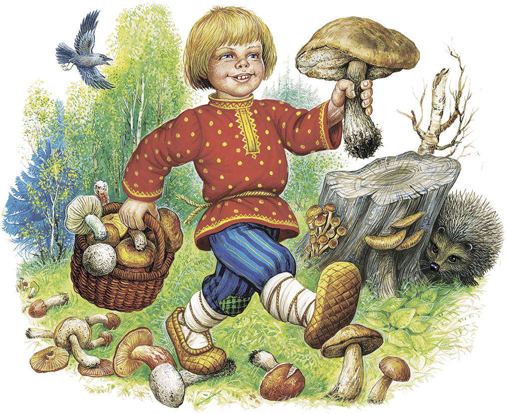 – Нет, ты сморчок! – говорит гриб-боровик. – Прячься скорей!
