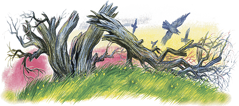 Выскочила коряжина-моряжина из болота. Вокруг Лесовика закружила, за бороду схватила и в воду потащила. Лесовик головой завертел, страшным голосом загудел. Дятлы услыхали, из леса прилетали. Принялись коряжину-моряжину длинными носами долбить. Всю по щепочкам расклевали, по земле разбросали. Лесовик схватил Болотника за зелёные волосы и на берег из воды вытащил. Болотник испугался, просит: