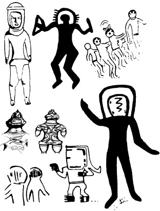 • фрески Тассили, открыты в Сахаре. На них изображения «марсиан» величиной в несколько метров, в костюмах, похожих на скафандр (так называемый «Великий бог из Джабаррена» и др.), которым 4–8 тыс. лет. Подобный «скафандр» и на этрусских изображениях;