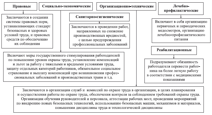 Реализация государственной политики в области ОТ осуществляется через взаимосвязанный комплекс нормативно-правовых актов по различным разделам деятельности. Эти мероприятия носят характер правовых, социально-экономических, организационно-технических, санитарно-гигиенических, лечебно-профилактических, реабилитационных и иных форм деятельности (рис. 1.6).