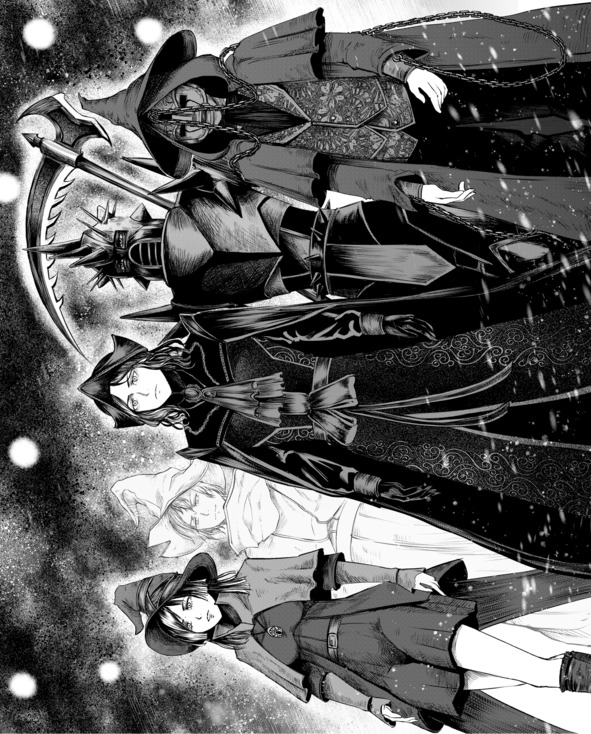 Владыки Волгаста и Весска обернулись и увидели, как маги, пребывающие рядом, склонились перед пятью высокими фигурами, идущими в их сторону. Эти некто были совершенно иначе одеты, чем остальные маги. Каждый выглядел уникально. Один, самый высокий из них, был облачен в темный доспех с двумя острыми выступающими элементами на наручах и носил причудливой формы шлем, закрывающий его лицо полностью. Из шлема торчали шипы разных размеров – наверное, для устрашения врагов, хотя у них могло быть и практичное применение. Так или иначе, шипы эти были расположены по всему забралу, а самые острые и длинные из них образовывали над шлемом подобие шляпы колдуна. Такие шляпы носили все пятеро, но каждая имела неповторимый вид. За спиной у широкоплечего мага-воина была поистине внушительных размеров коса, каждое лезвие которой было испещрено маленькими зубцами. Рядом с этой серьезно выглядевшей персоной шествовал тот, кто по внешнему виду был полной противоположностью. Лицо его было открытым и поражающим своей нечеловеческой красотой. Моложавый мужчина был одет в просторный белый плащ с золотистыми узорами на нем. Светлые волосы его развевались на ветру, а янтарные глаза словно отражали все бескрайние луга Граалиуса. Вот только кожа его была удивительно бледной, даже полупрозрачной. Перед двумя столь отличимыми друг от друга персонами шла утонченная, молодая и привлекательная девушка. Темно-бирюзовый плащ ее ниспадал до самой земли, а под ним виднелось легкое одеяние и амулет в виде пламенеющей маски. Рядом с ней уверенным шагом шествовал облаченный в легкий кожаный доспех мужчина с маской иного вида на лице. Маска эта была не только интересна и необычна визуально, но прикреплена к наручам на запястьях носителя двумя цепями, выходящими из нее сзади. Перед всей четверкой шел вполне себе не выдающийся своими внешними признаками мужчина. Одет он был в черную мантию с опущенным вниз воротником, покрывающим оба плеча, имевшим зеленоватый отлив, а на голове его красовалась остроконечная треуголка. Из-под нее ниспадали на плечи волнистые золотисто-каштановые волосы. Лицо его было столь же молодо и красиво, как и у остальных, но взгляд его был не только серьезен и внимателен. Было в нем что-то неподвластное для понимания, что-то спрятанное под ним.