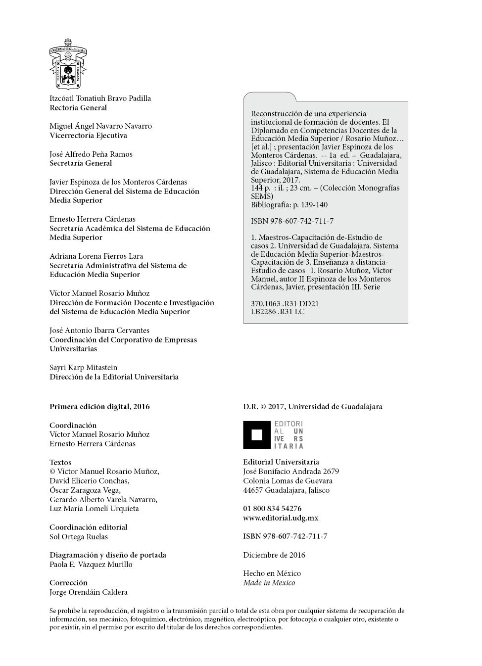 Esta obra que el Sistema de Educación Media Superior de la Universidad de Guadalajara pone en sus manos, tiene la intención de aportar algunas reflexiones y argumentos para el debate de las ideas en torno a la formación docente, a partir de los resultados obtenidos en el programa del Diplomado en Competencias Docentes para la Educación Media Superior modalidad en línea, que ofertó la Subsecretaría de Educación Media Superior a través de la Coordinación Sectorial de Desarrollo Académico y que la Universidad de Guadalajara operó en 10 estados del país durante el año 2015, y por medio del cual se atendieron a 3000 profesores de las diferentes modalidades y tipos de programas educativos en el nivel medio superior.