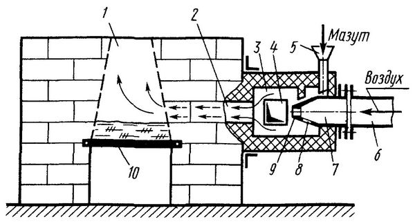 Горны, работающие на жидком или газообразном топливе, – это нагревательные устройства камерного или шахтного типа (рис. 1.1.12), состоящие из камеры нагрева (п.1) и топочной камеры (п.3). Обе камеры изнутри облицованы огнеупорным материалом. Воздух в камеру поступает по патрубку (п.6) через коническое сопло (п.7) и отверстия (п.9) и (п.8). Топливо подается сверху через воронку (п.5), стекает по соплу (п.7) и подхватывается струей воздуха, распыляется и сгорает. Разжигают смесь через специальное окно (п.4), в которое вводят горящий факел. По мере разогрева камеры увеличивают подачу воздуха и топлива и устанавливают необходимый режим горения.
