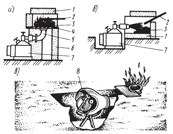 Рис. 1.1.13. Простейшие горны: а, б – с паяльной лампой; в – с вентилятором.