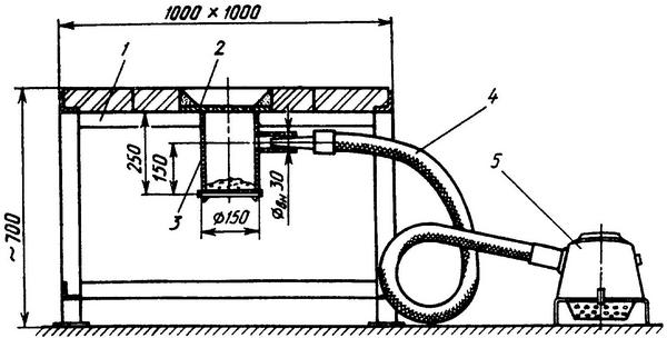 Конструкция легкого переносного горна с бытовым пылесосом показана на рис. 1.1.14. Постамент горна (п.1) сварен из уголков, а стол горна выложен из огнеупорного кирпича. К верхним горизонтальным уголкам приваривается зольник (п.3), сверху которого плотно укладывается чугунная фурма (п.2). На высоте 150 мм от основания к зольнику приваривается патрубок с внутренним диаметром 30 мм, в который вставляется носик шланга (п.4) пылесоса (п.5). При этом необходимо иметь в виду, что шланг должен быть вставлен в верхнее гнездо пылесоса, а нижнюю чашку пылесоса с фильтром снимают, и пылесос устанавливают на подставку.