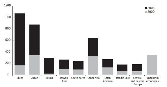 В начале XXI в. гигантские валютные резервы накапливают экспортно ориентированные страны, в первую нефтедобывающие и крупнейшие развивающиеся (рис. 1.9). Среди развитых стран только Япония смогла поддерживать высокие темпы роста валютных резервов. Доля развитых стран (кроме Японии) в валютных резервах упала за шесть лет с 20 до 8 %.