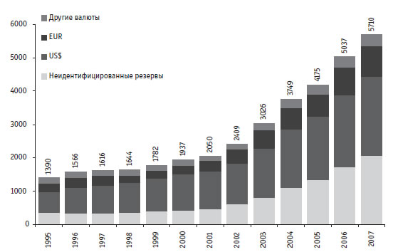 Впрочем, реальный расклад сил среди мировых резервных валют может быть иным, ведь огромную и быстро растущую долю валютных резервов составляют так называемые неидентифицированные валютные резервы[6]. За период с 1999 по 2007 г. доля этих резервов выросла с 23 до 36 % (рис. 1.10). Произошло это во многом благодаря Народному Банку Китая, который не раскрывает структуру своих валютных резервов. А в таких резервах, естественно, есть и доллары, и евро, и другие валюты.