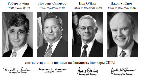 В 90-х гг. прошлого века значительное влияние на валютный рынок оказывал Роберт Рубин (Robert Rubin), который с 10 января 1995 г. по 2 июля 1999 г. занимал должность секретаря Казначейства США (Secretary of the Treasury, U.S. Department of Treasury). Сразу после него и до завершения президентства Билла Клинтона этот пост занимал Лоуренс Саммерс (Lawrence H. Summers). С 20 января 2001 г. следующим 72-м министром финансов, иногда еще так называется должность секретаря казначейства, был Пол О'Нил (Paul H. O'Neill). С 13 января 2003 г. секретарем казначейства стал Джон Уильям Сноу (John William Snow), реально вступивший в эту должность 3 февраля. Неизвестно, какую роль сыграл Сноу в девальвации доллара 2003 г., однако падение американского доллара против евро за этот год на 17.5 % (с 1.04 до 1.26) можно приписать его целенаправленной политике. 10 июля 2006 г. вступил в должность очередной, 74-й секретарь казначейства (глава Минфина) США – Генри М. Поулсон-младший (Henry M. Paulson, Jr.). До этого г-н Поулсон занимал пост руководителя (CEO) Goldman Sachs, одного из крупнейших американских банков, в котором работал с 1974 г. Политика слабого доллара продолжилась. Хотя с точки зрения Минфина, вынужденного привлекать иностранных инвесторов с целью покупки американских государственных облигаций для финансирования огромного бюджетного дефицита и государственного долга, ослабление доллара нежелательно. Ведь для покрытия убытков кредиторов США, возникающих в период ослабления доллара, казначейство вынуждено поднимать процентные ставки, что еще больше увеличивает нагрузку на госбюджет. Но об этом мы поговорим подробнее немного позже.