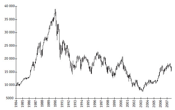 Декабрь 1989 г. – исторический максимум (рис. 1.13) японского фондового индекса Nikkei-225 (38 957 пунктов). Бум на фондовом рынке Токио был спровоцирован мягкой денежной политикой Банка Японии. С целью стимулировать внутренний спрос в 1987 г. он понизил учетную ставку до 2.5 %. Впоследствии, чтобы остановить бум, в 1989 и 1990 гг. Банк Японии предпринял ряд повышений учетной ставки (всего 5 раз), доведя ее до 6 %. Результатом резкого денежного сжатия стало ограничение кредитования и последующий крах финансового рынка и рынка недвижимости Японии.