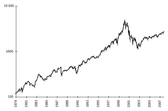 Рис. 1.16. Динамика американского фондового индекса Nasdaq Composite (логарифмическая шкала)