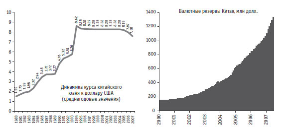 Рис. 1.20. Динамика официального курса китайского юаня против доллара США и валютных резервов Народного Банка Китая