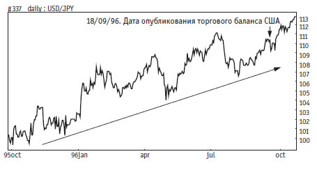 Как правило, короткий цикл жизни – у всех неожиданных новостей и составляет не более суток. Например, на представленном на рис. 1.22 часовом графике японской иены к доллару США за одну рабочую неделю с 16 по 21 сентября 1996 г. показано сильное падение доллара 18 сентября. Это падение произошло только по причине опубликования Министерством торговли США торгового баланса за август. Данные показали больший (более $11 млрд) торговый дефицит США по сравнению с ожидавшимся дефицитом около $4 млрд. Такая разница между ожиданиями и фактом усилили иену по отношению к доллару за два часа более чем на 150 пунктов, несмотря на существовавший очень сильный бычий тренд по доллар/иене. Но уже к концу недели курс отыграл половину этого падения, а в начале следующей (на приведенном графике этого не видно) продолжил движение вверх, намного превысив предыдущую максимальную котировку.
