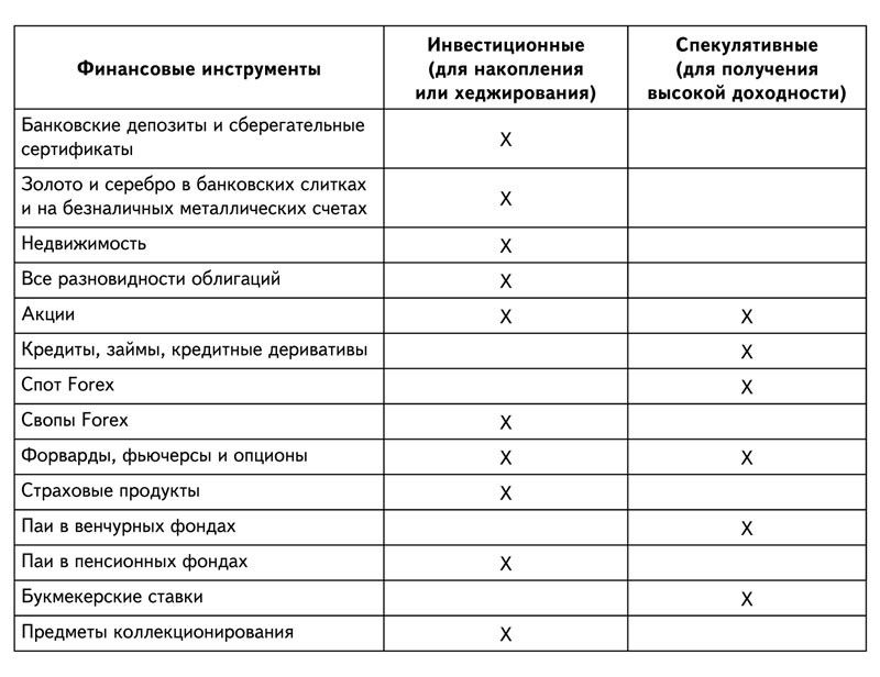 В следующей таблице крестиком отмечены финансовые инструменты, относящиеся к инвестиционному и/или спекулятивному типу