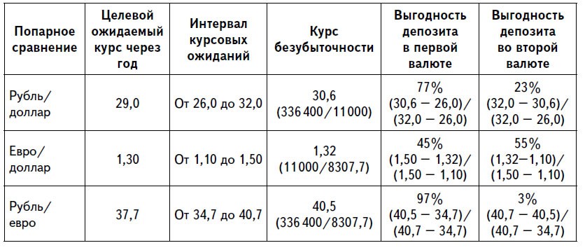 А теперь сделать выбор очень просто. Чего вы больше ожидаете – что курс RUB/USD через год окажется ниже 34,04 (374 400/11 000) или выше? Если вы остановитесь на варианте номер один, тогда ваш выбор – рублевый депозит. Если же вы думаете, что курс RUB/USD через год окажется выше 34,04, то вам стоит предпочесть долларовый вклад. Так что выбор зависит от ваших ожиданий. А если у вас нет никакого мнения по этому поводу, то можете воспользоваться экспертными оценками. Только не верьте обещаниям политиков, они за свои слова точно не отвечают.