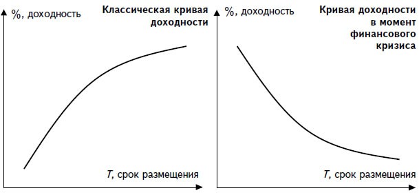 При работе с облигациями – долговыми инструментами, по которым гарантируется получение регулярных фиксированных процентов, очень важно прогнозировать кривую доходности. Например, кривая доходности долговых инструментов может выглядеть по-разному в обычной, классической ситуации и во время финансового кризиса (рис. 1.7).