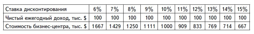 Рассмотрим весьма упрощенный пример расчета стоимости бизнес-центра, который приносит $100 000 ежегодно.