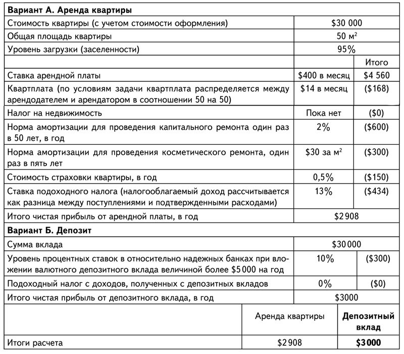 Вопрос № 4. Выберите, какая инвестиция лучше – покупка квартиры для сдачи в аренду или банковский депозит.