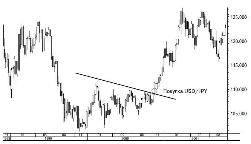 Рассмотрим пример приобретения долларов США против японской иены. По этой паре долгое время наблюдались значительные положительные свопы, обусловленные более высокими процентными ставками в США по сравнению с Японией, где они, наоборот, были близки к нулю (рис. 1.8).