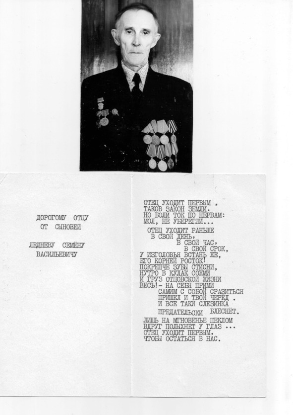 Для нашего вымирающего, бывшего рабочего посёлка Заводоуспенское, Тугулымского округа, Свердловской области, семья Леднёва Дмитрия Семёновича образец стойкости в невзгодах. Через него я получаю всю информацию о сегодняшней жизни посёлка, людей населяющих его. Это и есть связь поколений, необходимость которой мы и воспитываем в наших детях. Пока мы живы, наша память скрепляет добрые чувства и намерения в делах.