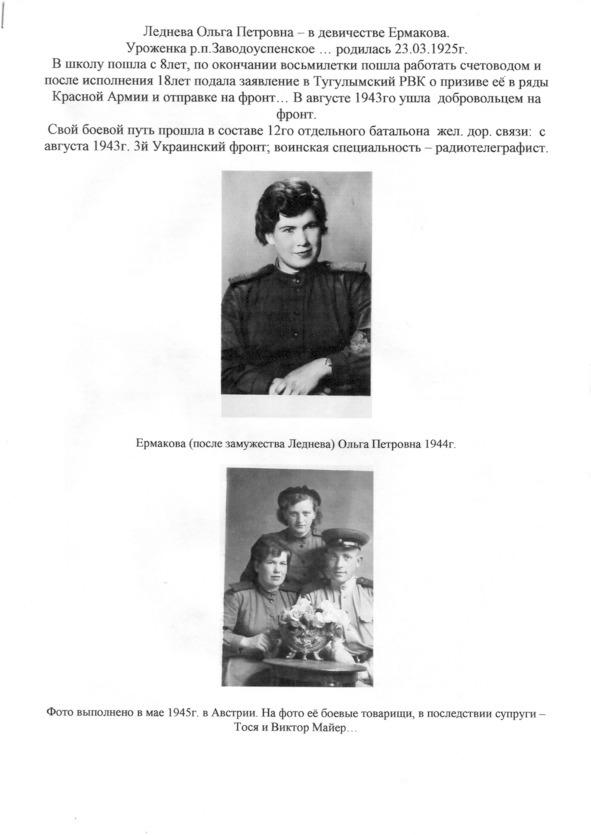 Леднёва Ольга Петровна, радиотелеграфист, на фронт ушла добровольно в августе 1943года, в возрасте 18 лет. Долго добивала такого разрешения, человек редкого мужества и обаяния. В нашей памяти осталась как добрый, улыбчивый человек при встрече в любых жизненных обстоятельствах. Вырастила троих прекрасных сыновей. В их семьях царят добрые отношения и взаимное уважение, воспитанные Ольгой Петровной и строгим отцом, Семёном Васильевичем Леднёвым.