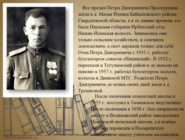 Материал мне любезно предоставил мой одноклассник, старший и единственный сын семьи Проскурниных, Владимир Петрович Проскурнин, проживающий в г. Сухой Лог, Свердловской области. До ухода на пенсию, он занимал пост заместителя Мэра города Сухой Лог,. Уважаемый человек, житель этого, ветеран труда.