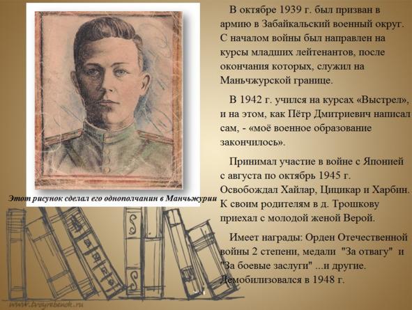 Проскурнин Петр Дмитриевич,15.06. 1919—21.08.2005 г., Забайкальский фронт. Награды: Орден Отечественной войны 2 степени. медаль За боевые заслуги, За победу над Японией и др. Был командиром взвода противотанковых орудий. Особенно отмечал взятие Харбина и Цицикара… Самураи умели воевать и были очень упорны в бою. Пётр Дмитриевич помнил, как они трое суток сидели в окопах заполненных водой под огнём снайперов и прикованных к пулемётам смертников… На память об этом эпизоде войны остались хронические болезни, память о погибших друзьях… Капитан Красной Армии. Преподавал историю… Был директором вечерней и средней школ……