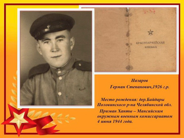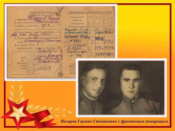 Так мой старший брат, Назаров Герман Степанович, 1926 года рождения, девятнадцатилетним, возмужавшим и закалённым в горниле Великой Отечественной Войны, пареньком встретил Победу в Праге, в составе своего 741-го, ордена Александра Невского стрелкового полка, 128-й Псковской Краснознамённой стрелковой дивизии, 118 корпуса.