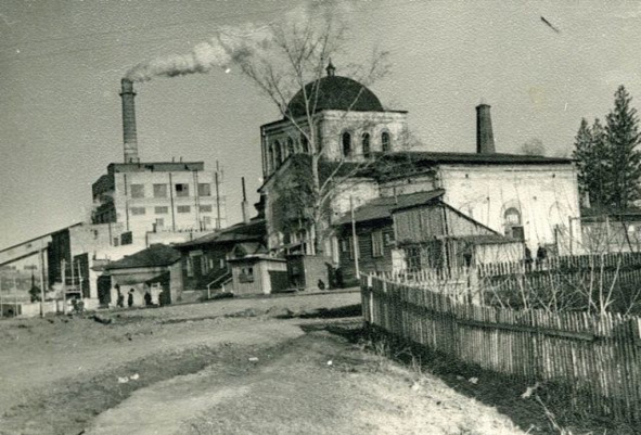 Вид на Успенскую фабрику и Храм Пресвятой Богородицы. Заводоуспенка, весна 1965 года.