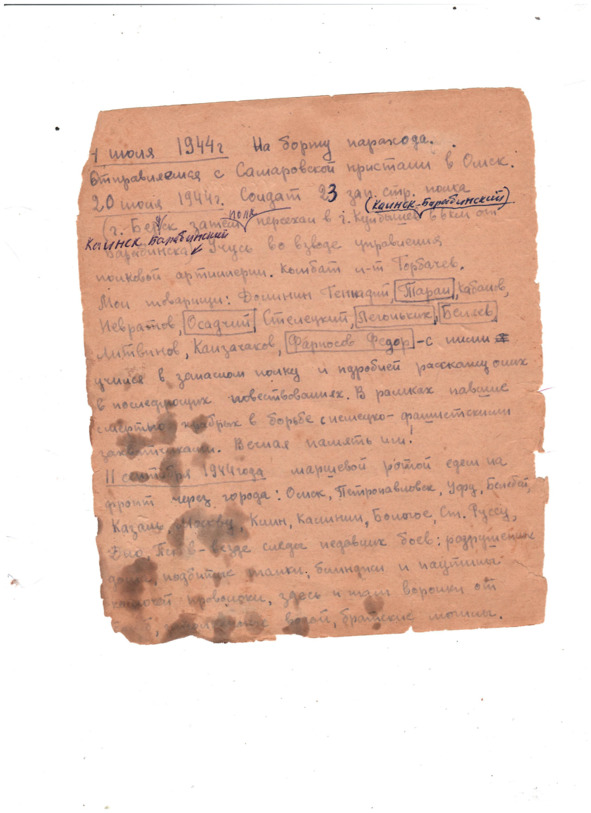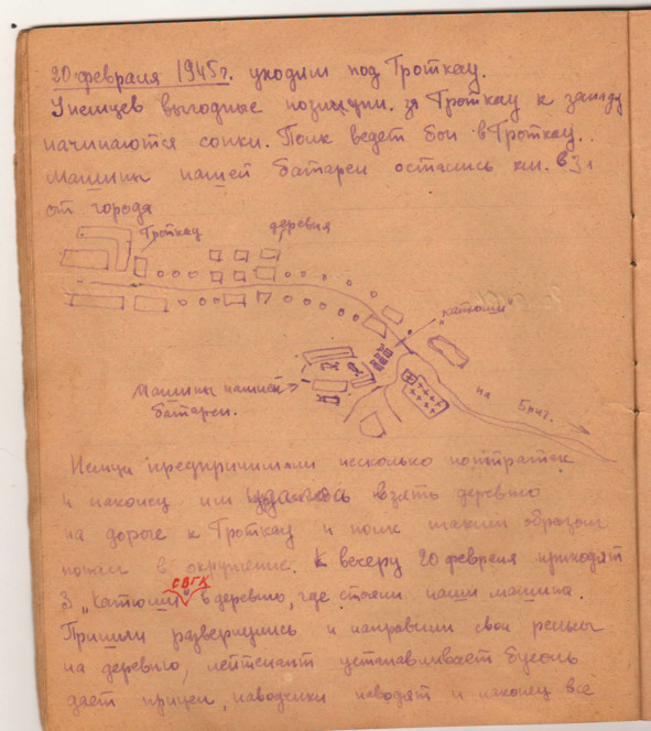 Вспотевший до предела, вхожу в прохладу каштана и докладываю комбату о решении командира полка. Андросов поздравляет меня с повышением и просит не посрамить честь солдата батареи. После этого рапорта спешу к друзьям-шоферам поделиться радостью. Захожу в большой сарай, крытый черепицей, где стоят машины Гриценко и Конашкина, присоединяюсь к солдатскому обеду, состоящего из борща и каши со свининой. Вдруг послышался шум моторов немецких самолётов, выскакиваем из сарая и смотрим, как четыре фоке-вульф делают заход на соседнюю деревню. Первый самолёт вдруг пошёл в пике и скрылся за деревьями рощи, окружавшей кольцом деревню.