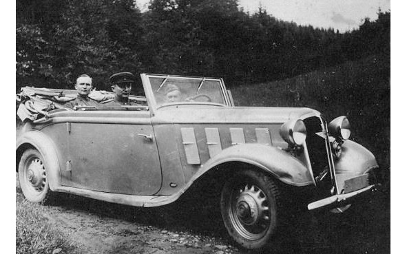 Герман за рулем машины сопровождает командира полка И. И. Баранова, весна 1945 года, вблизи города Бреслау.