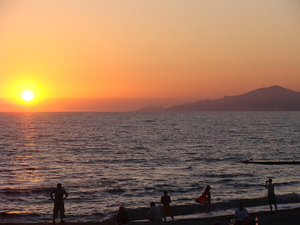 За нашим увлечённым и смешным разговором обо всём на свете, не заметили, как стало вечереть, подошло время вечерней прогулки и купания в море на закате солнца. Все взрослые и мы с Маринкой, отправились к ближнему от нас пляжу «Адлер».