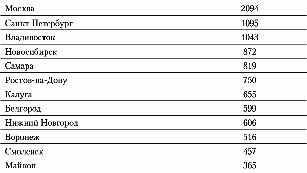 В целом по стране шли похожие процессы. Так, например, в конце 90-х годов в разных городах России сложились следующие цены на жилье (в долларах США за кв. м) (табл. 6–7).