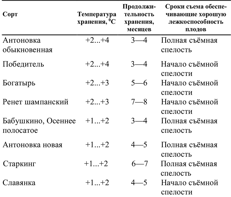 Продолжительность хранения и осенних, и зимних сортов зависит от вида съема, качества плодов, степени зрелости перед закладкой на хранение, температуры и относительной влажности воздуха в хранилище.