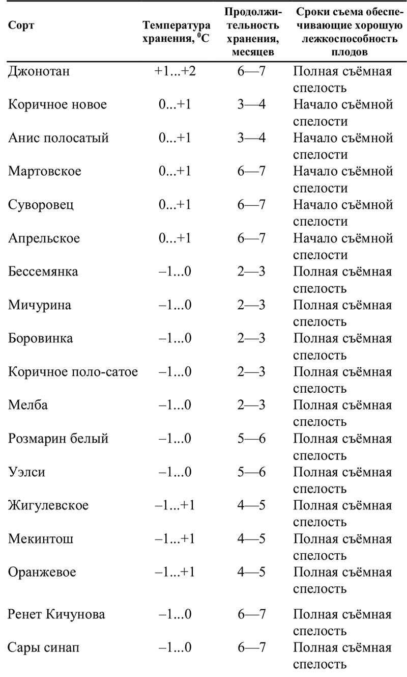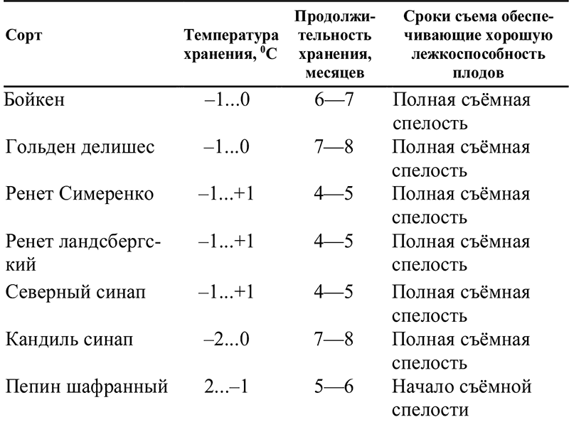 Зимние сорта яблок: Бабушкино, Бельфер, Бойкен, Золотое Грайма, Кальвиль снежный, Кандиль-синап, Пепин лондонский, Пепин шафранный, Ренет Баумана, Ренет ландсбергский, Ренет Симеренко, Ренет шампанский, Розмарин, Сары синап сохраняются в течение 4-7 месяцев при температуре ОС, но не выше +5С.