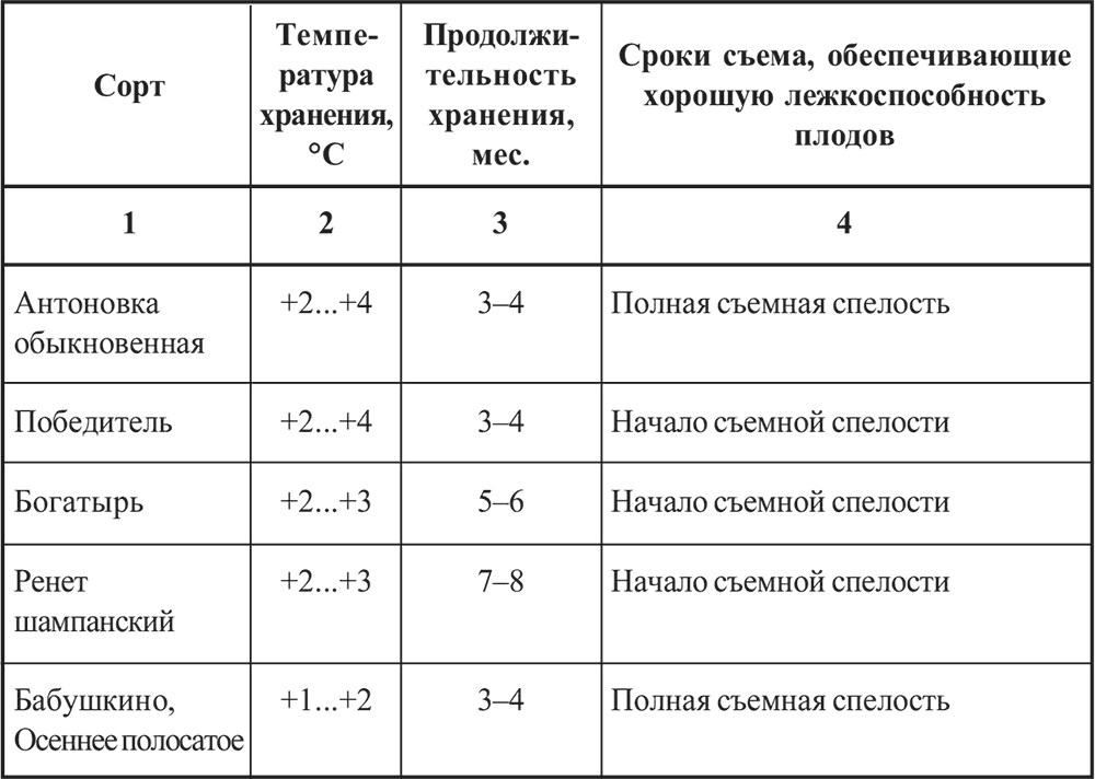 Осенние сорта яблок: Осеннее полосатое, Анис, Антоновка, Старт и другие сохраняются до двух месяцев при температуре 0 °С.