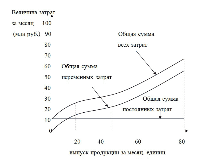 Рис. 1. Структура общих затрат и различия в изменении сумм постоянных и переменных затрат при изменении объемов производства