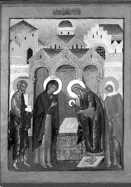 В это время пришел в храм, по внушению Духа Святого, старец Симеон и, приблизившись к благодатной Марии, принял из Ее рук Новорожденного, почему и называется Богоприимцем. Прославив Бога, старец в священном восторге произнес пророчественную песнь о Спасителе мира: Ныне отпущаеши раба Твоего, Владыко, по глаголу Твоему, с миром, яко видеста очи мои спасение Твое, еже еси уготовал пред лицем всех людей: свет во откровение языком и славу людей Твоих Израиля (Лк. 2, 29–32).
