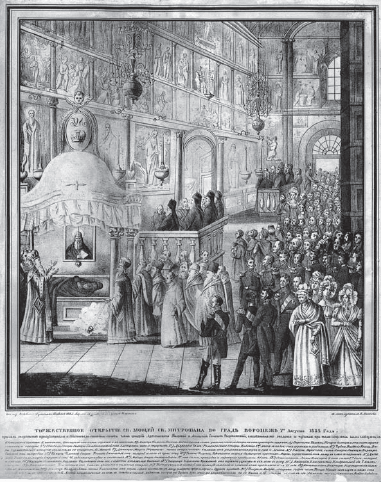 Открытие мощей святителя Митрофана Воронежского. 1833 год. Литография В. Логинова (частное собрание)