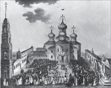 Перенесение мощей святителя Митрофана Воронежского 25 июня 1833 года. Гравюра XIX века