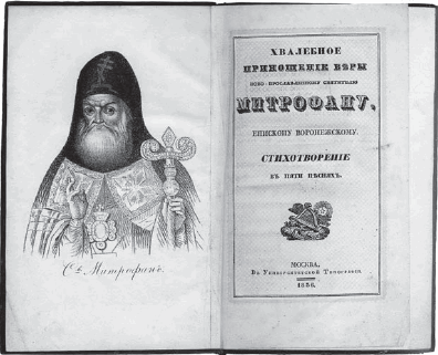 Святитель Митрофан Воронежский. Около 1836 года. Титульные листы из книги «Хвалебное приношение веры новопрославленному святителю Митрофану, епископу Воронежскому» (М., 1836)