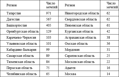 Наибольшее число мечетей зарегистрировано (данные на 2002 г.) в Татарстане – 971. В Дагестане их на 404 меньше, но и населения там существенно меньше, так что мы наблюдаем приблизительно равное число мечетей на душу населения в этих республиках – по одной мечети на 10 тыс. человек. В Башкортостане в 2003 г. было зарегистрировано 405 мечетей, в соседней Оренбургской области – 129, в Карачаево-Черкесии – 103, в Ульяновской области – 101, в Кабардино-Балкарии – 99, в Самарской области – 89, в Тюменской области, исторически имевшей существенное татарское население, в советское время дополненное нефтяниками из Башкортостана, Татарстана и Азербайджана, – 84, в Пермской области – 75, в Челябинской – 65, в Нижегородской и Свердловской областях по 62, в Пензенской области – 61, в Курганской – 42, в Астраханской области – 38 мечетей. Таблица 2 показывает, что еще в ряде областей и республик страны – более чем по 10 мечетей; к регионам с более чем 10 зарегистрированными мечетями относится и российская столица, в которой в 2003 г. было зарегистрировано 14 мусульманских общин, имеющих центры религиозного поклонения – мечети. У нас нет статистики по поводу того, какая часть из этих зданий – построенные по специальному плану мечети, а какая – прочие сооружения, переоборудованные под центры религиозного поклонения мусульман, но, как правило, в последние годы все больше в России именно специально построенных мечетей.
