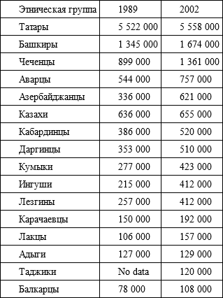 Крупнейший этнос России, представители которого исповедуют преимущественно ислам, – это татары. Их число по переписи 2002 г. составляло 5 558 000 человек. Примечательно, что прирост этой группы составил всего лишь 0,7 %, всего на 36 тыс. человек, в то время как число чеченцев за 11 лет (и каких непростых для Чечни!) с 1991 по 2002 г. увеличилось с 899 тыс. до 1 млн. 361 тыс. В общем и целом наблюдается значительно больший прирост населения на Северном Кавказе, чем в Волго-Уральском районе, что способствует росту значения Северного Кавказа как одного из основных центров ислама в России.